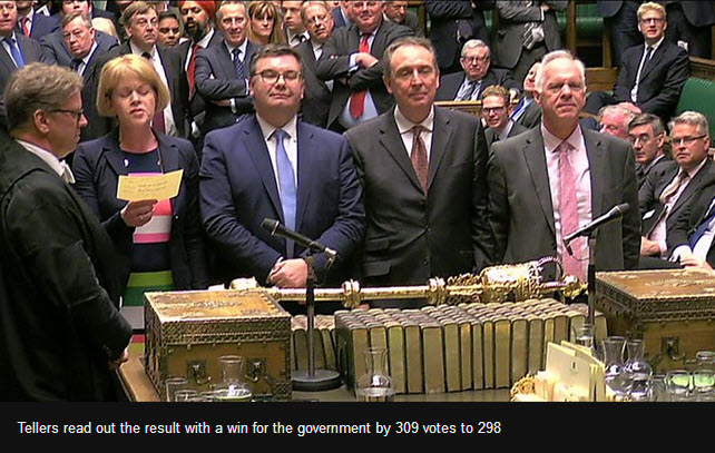 ทั้งนี้ สมาชิกรัฐสภาลงมติด้วยคะแนนเสียง 309 ต่อ 298 เสียง คว่ำญัตติของพรรคแรงงานดังกล่าว