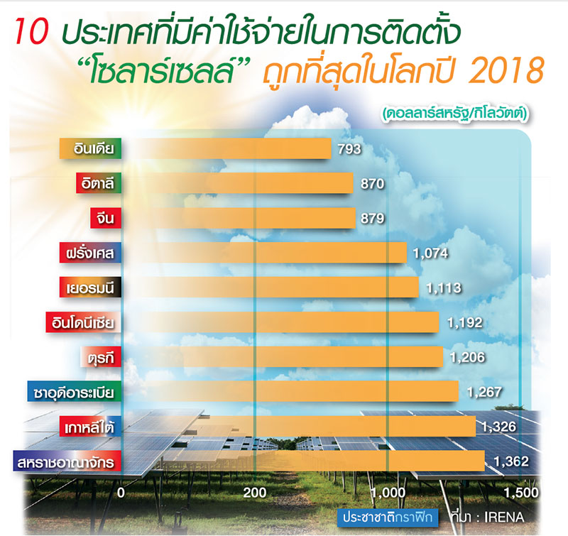 รายงานการสำรวจหัวข้อ “ค่าใช้จ่ายในการติดตั้งพลังงานแสงอาทิตย์ของโลกปี 2018” IRENA ชี้ว่า “อินเดีย” เป็นประเทศที่ผลิตพลังงานแสงอาทิตย์ หรือ “โซลาร์เซลล์” มีค่าใช้จ่ายถูกที่สุดในโลก ประจำปี 2018 โดยมีราคาเริ่มต้นอยู่ที่ 793 ดอลลาร์สหรัฐ/กิโลวัตต์ หากเทียบกับประเทศที่มีค่าใช้จ่ายในการติดตั้งโซลาร์เซลล์แพงที่สุดในโลกอย่าง “แคนาดา” มีราคาสูงถึง 2,427 ดอลลาร์สหรัฐ/กิโลวัตต์