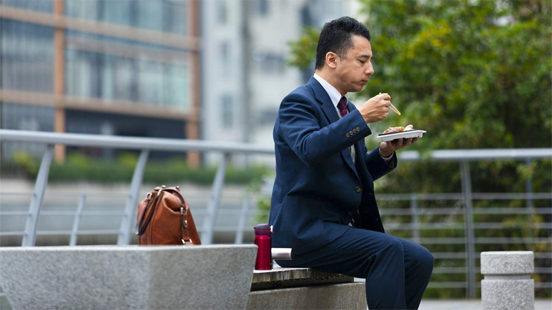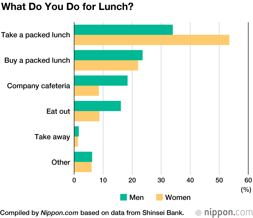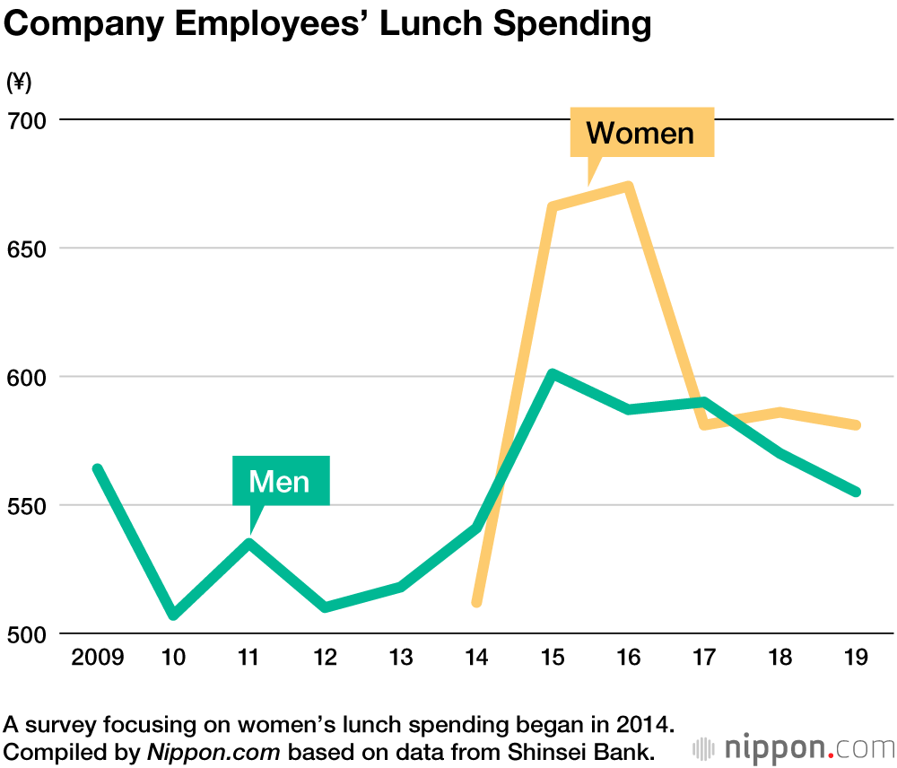 การสำรวจดูสถานการณ์อาหารกลางวันของพนักงานออฟฟิศซึ่งเริ่มในปี 2009 แสดงให้เห็นว่าในปี 2019 ผู้ชายใช้จ่ายอาหารกลางวันโดยเฉลี่ยลดลง 15 ถึง 555 เยน (5 – 160 บาท) ส่วนผู้หญิงลดลง 5 ถึง 581 เยน (2 – 170 บาท)