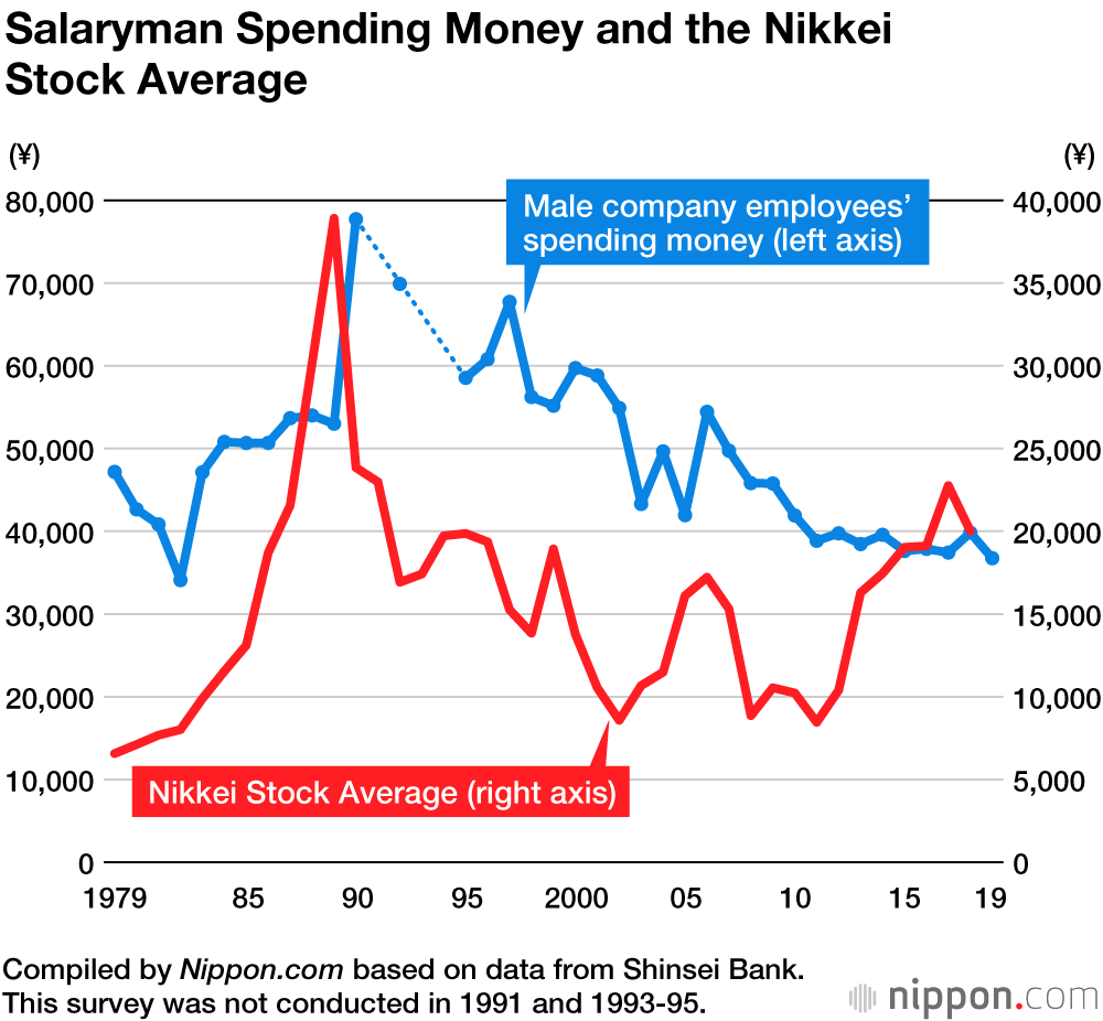 เมื่อดูจากการใช้จ่ายเงินของพนักงานพบว่าโดยเฉลี่ยในปี 2019 พนักงานชายใช้จ่ายเดือนละ 36,747 เยน (10,500 บาท) ลดลง 3,089 เยน (882 บาท) เมื่อเทียบกับผลสำรวจของปีที่ผ่านมา โดยตัวเลขนี้ถือเป็นจำนวนเงินที่ใช้จ่ายน้อยที่สุดเป็นอันดับ 2 นับตั้งแต่เริ่มสำรวจในปี 1979 (ต่ำสุดคือ 34,100 เยนในปี 1982)