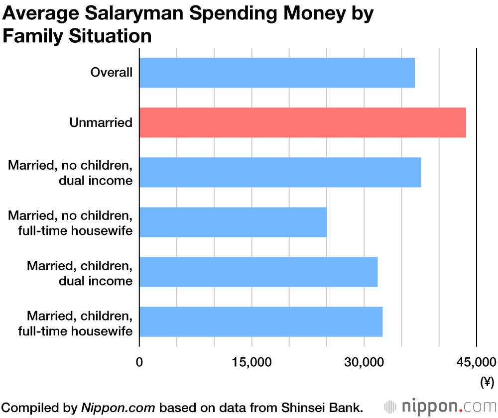 ขณะที่กลุ่มผู้ชายที่ยังไม่ได้แต่งงานมีค่าใช้จ่ายเฉลี่ย 43,608 เยน กลายเป็นช่องวางขนาดใหญ่เมื่อเทียบกับกลุ่มที่แต่งงานแล้ว ที่มีการใช้เฉลี่ย 25,000 – 35,000 เยน ยิ่งหากมีลูกที่กำลังเรียนชั้นประชมศึกษาหรืออายุน้อยกว่า ก็มีแนวโน้มที่จะใช้จ่ายเงินส่วนตัวลดลงไปอีก ข้อนี้ชี้ให้เห็นว่า “ค่าใช้จ่ายในการเลี้ยงดูเด็กและค่าธรรมเนียมการศึกษา” เป็นภาระหลักของครัวเรือน