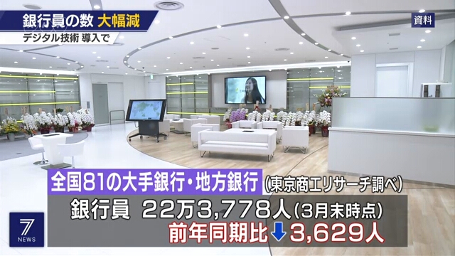 จำนวนพนักงานธนาคารในญี่ปุ่นลดลงราว 3,629 คน ในช่วง 1 ปีจนถึงวันที่ 31 มีนาคม นี่เป็นการลดลงครั้งที่ใหญ่ที่สุดนับตั้งแต่ปี 2549 เมื่อครั้งที่มีการรวมกลุ่มกันก่อตั้งเป็นกลุ่มการเงินขนาดใหญ่ 3 แห่งของญี่ปุ่นคือ Mitsubishi UFJ Sumitomo Mitsui และ Mizuho