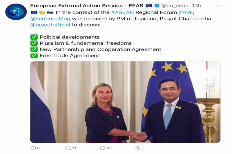 ผู้แทนระดับสูงด้านนโยบายต่างประเทศและความมั่นคงของสหภาพยุโรปยืนยันอาเซียนคือพันธมิตรทางการค้าที่สำคัญ แต่ด้วยข้อจำกัดด้านกฎหมายของสมาชิกบางประเทศทำให้แนวโน้มการบรรลุเอฟทีเอในนามอาเซียนอาจลำบาก อียูจึงปรับแผนเร่งเครื่องเจรจาเป็นรายประเทศ หนึ่งในนั้นคือไทย
