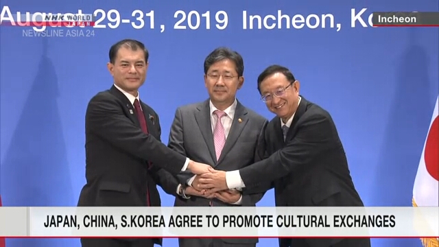 นายมาซาฮิโกะ ชิบายามะ รัฐมนตรีกระทรวงศึกษาธิการ วัฒนธรรม กีฬา วิทยาศาสตร์ และเทคโนโลยีของญี่ปุ่น นายปัก ยัง-วู รัฐมนตรีกระทรวงวัฒนธรรมของเกาหลีใต้ และนายลั่ว ซู่ กัง รัฐมนตรีกระทรวงวัฒนธรรมของจีน ได้ลงนามในแถลงการณ์อินชอน หลังสิ้นสุดการประชุมที่เมืองอินชอนของเกาหลีใต้ ในวันศุกร์ที่ 30 สิงหาคม