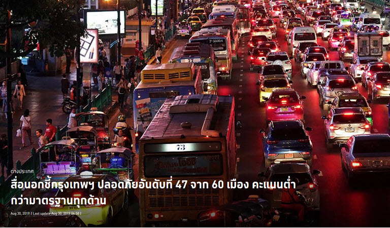 ทีมวิจัยข้อมูลของดิอีโคโนมิสต์ เผยรายงานประจำปี 2019 ชี้กรุงเทพฯ ปลอดภัยเป็นอันดับที่ 47 จาก 60 เมืองทั่วโลกที่ทำการศึกษา ทั้งด้านดิจิทัล สุขภาพ โครงสร้างพื้นฐาน และความปลอดภัยส่วนบุคคล ชี้รายได้ของคนในเมืองและความโปร่งใสในการบริหาร เป็นสองปัจจัยหลักสัมพันธ์กับความปลอดภัยของเมือง