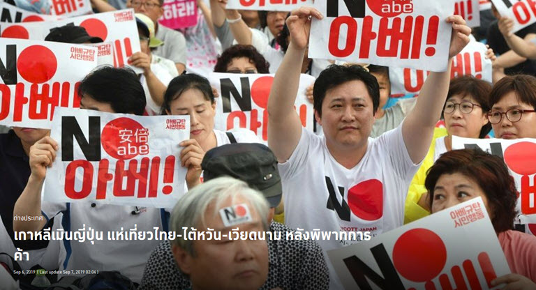 หลังจากชาวเกาหลีใต้พากันแบนการใช้สินค้าและบริการจากญี่ปุ่น เนื่องจากข้อพิพาททางการค้า และความขัดแย้งทางประวัติศาสตร์ ข้อมูลการจองที่พักและเที่ยวบิน ชี้ว่าเกาหลีใต้หันมาเที่ยวเวียดนาม ไต้หวัน และประเทศไทยแทน โดยบ้านเราเพิ่มขึ้นถึง 249 เปอร์เซ็นต์