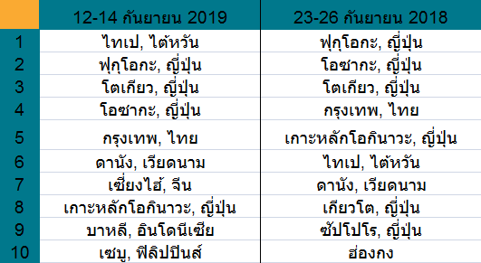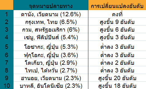 รองจากไทเปแล้ว อันดับถัดมาคือแชมป์เก่าอย่างเมืองฟุกุโอกะ โตเกียว และโอซาก้า ของประเทศญี่ปุ่น ตามด้วยกรุงเทพฯ เป็นอันดับที่ห้า อีก 5 อันดับที่เหลือในเมืองท็อป 10 คือดานัง ประเทศเวียดนาม เซี่ยงไฮ้ ประเทศจีน เกาะหลักโอกินาวะ ประเทศญี่ปุ่น บาหลี ประเทศอินโดนีเซีย และเซบู ประเทศฟิลิปปินส์