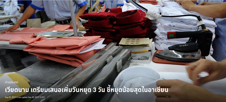 สมาพันธ์แรงงานเวียดนาม เตรียมเสนอสภาให้เพิ่มวันหยุดอีก 3 วันต่อปี ชี้เวียดนามมีวันหยุดน้อยสุดเมื่อเทียบกับประเทศอื่นๆ ในอาเซียน
