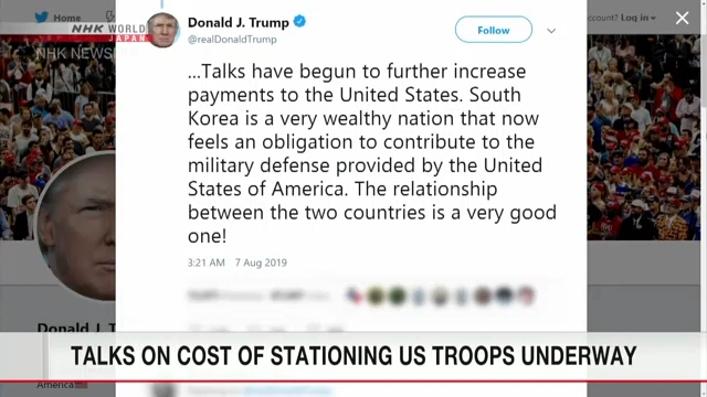 คาดว่าสหรัฐจะเรียกร้องให้เกาหลีใต้รับผิดชอบค่าใช้จ่ายเพิ่มขึ้นอีกสำหรับปี 2563 ทั้งนี้เมื่อเดือนที่แล้ว ประธานาธิบดีโดนัลด์ ทรัมป์ ของสหรัฐได้กล่าวทางทวิตเตอร์ว่า เกาหลีใต้เป็นชาติที่มั่งคั่งอย่างยิ่ง และขณะนี้ได้รับรู้ถึงภาระหน้าที่ที่จะต้องช่วยเหลือค่าใช้จ่ายสำหรับการป้องกันประเทศที่สหรัฐมอบให้