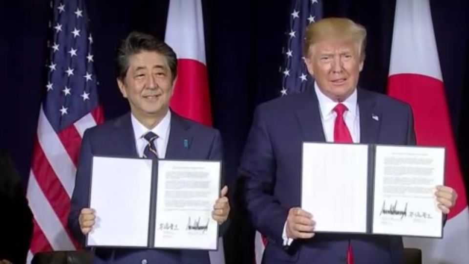 ประธานาธิบดีโดนัลด์ ทรัมป์ ผู้นำสหรัฐลงนามในข้อตกลงทางการค้าแบบจำกัดร่วมกับนายกรัฐมนตรีชินโซ อาเบะ ของญี่ปุ่น โดยข้อตกลงดังกล่าวจะลดภาษีให้กับสินค้าเกษตรสหรัฐ รวมทั้งภาษีสินค้าเครื่องจักร และสินค้าอื่นของญี่ปุ่น แต่ข้อตกลงดังกล่าวยังไม่ครอบคลุมถึงรถยนต์