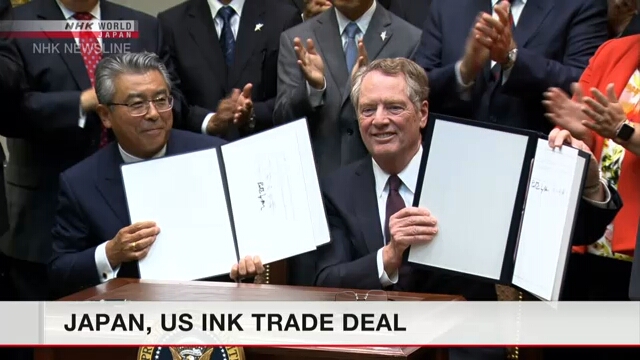 นายชินซูเกะ ซูงิยามะ เอกอัครราชทูตญี่ปุ่นประจำสหรัฐและนายโรเบิร์ต ไลต์ไฮเซอร์ ผู้แทนด้านการค้าของสหรัฐได้ลงนามร่วมกันที่กรุงวอชิงตันของสหรัฐ เมื่อวันจันทร์ที่ 7 ตุลาคม โดยมีนายโดนัลด์ ทรัมป์ ประธานาธิบดีสหรัฐเข้าร่วมสังเกตการณ์