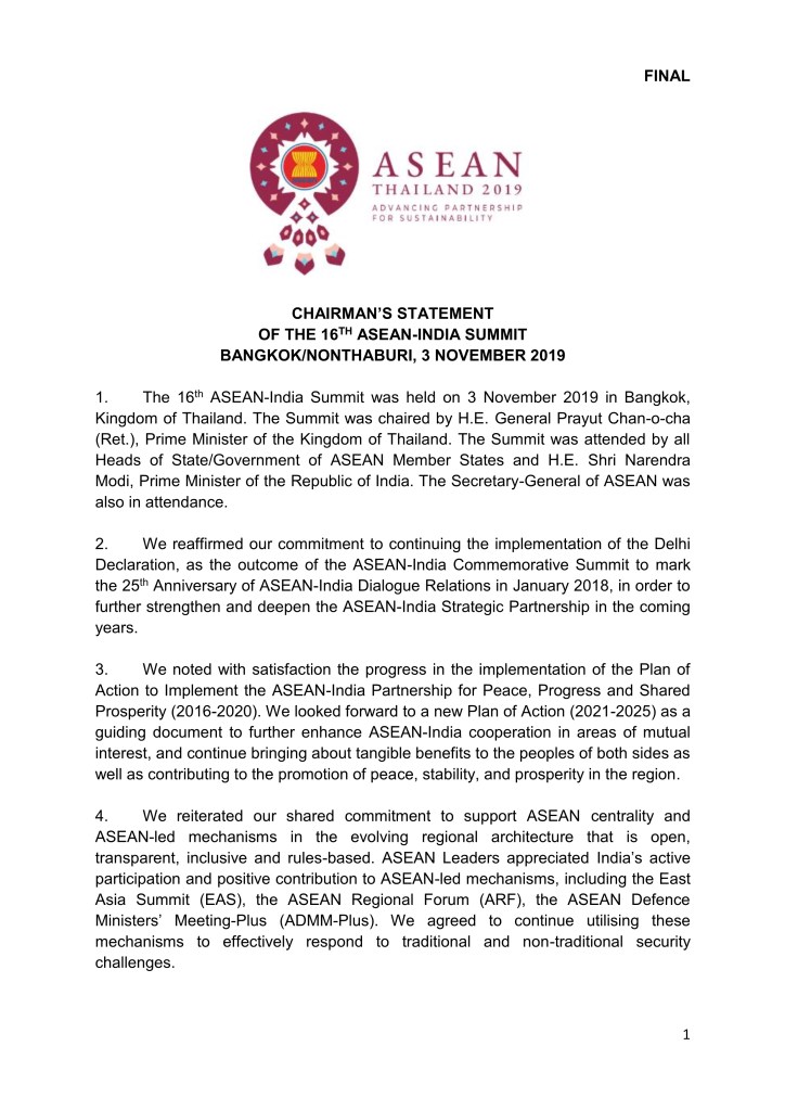 November 6, 2019November 6, 2019 apecasc CHAIRMAN’S STATEMENT OF THE 16TH ASEAN-INDIA SUMMIT BANGKOK/NONTHABURI 3 NOVEMBER 2019 กระทรวงการต่างประเทศ CR: กระทรวงการต่างประเทศ Share this: Click to share on X (Opens in new window) X Click to share on Facebook (Opens in new window) Facebook Like Loading...