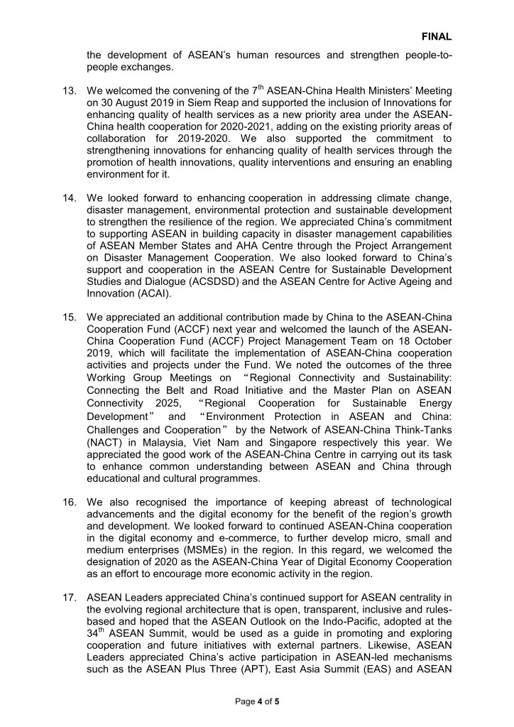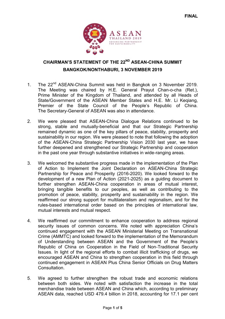 November 6, 2019November 6, 2019 apecasc CHAIRMAN’S STATEMENT OF THE 22ND ASEAN-CHINA SUMMIT BANGKOK/NONTHABURI 3 NOVEMBER 2019 กระทรวงการต่างประเทศ CR: กระทรวงการต่างประเทศ Share this: Click to share on X (Opens in new window) X Click to share on Facebook (Opens in new window) Facebook Like Loading...
