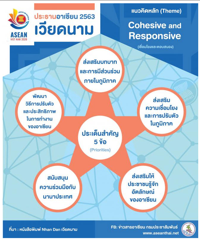 2. เวียดนามได้เลือกใช้แนวคิด “เชื่อมโยงและตอบสนอง (Cohesive and Responsive)” ในการเป็นประธานอาเซียน ปี 2563 เพื่อตอบสนองต่อความท้าทายที่เกิดจากการพัฒนาของสังคมโลกในปัจจุบัน รวมทั้งจะสร้างประชาคมอาเซียนให้แข็งแกร่งและเชื่อมโยงระหว่างกันมากยิ่งขึ้น โดยอาศัยผลการดำเนินงานที่ผ่านมาของอาเซียน พร้อมกับเน้นย้ำประเด็นสำคัญ 5 ข้อ ดังนี้