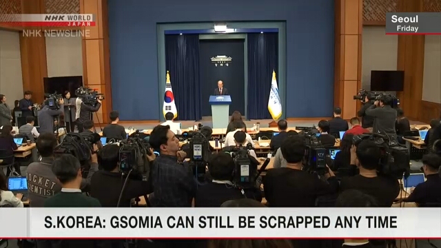 ทำเนียบประธานาธิบดีเกาหลีใต้เผยว่า การตัดสินใจของเกาหลีใต้ที่จะหลีกเลี่ยงการยุติข้อตกลงว่าด้วยข้อมูลการทหารเกี่ยวกับความมั่นคงปลอดภัยทั่วไป หรือจีโซเมีย ที่ทำไว้กับญี่ปุ่นนั้น เป็นการหลีกเลี่ยงโดยมีเงื่อนไขหลายอย่างพ่วงอยู่ด้วย