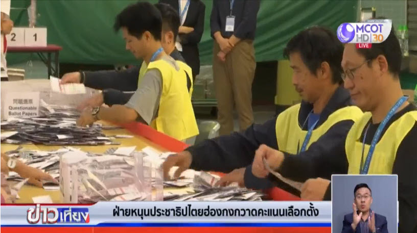 การเลือกตั้งสมาชิกสภาเขตของฮ่องกงเมื่อวานนี้ ซึ่งขณะนี้กำลังนับคะแนน ล่าสุดผลปรากฏว่าผู้สมัครฝ่ายเรียกร้องประชาธิปไตยสามารถกวาดที่นั่งไปแล้วถึง 333 ที่นั่งจากทั้งหมด 452 ที่นั่ง ขณะที่ผู้สมัครฝ่ายหนุนรัฐบาลได้ไปเพียง 52 ที่นั่ง และมีผู้สมัครอิสระได้ไป 12 ที่นั่ง เทียบกับเมื่อปี 2558 ฝ่ายเรียกร้องประชาธิปไตยได้ไปเพียงกว่า 100 ที่นั่งเท่านั้น นอกจากนี้ การเลือกตั้งในครั้งนี้ยังพบว่ามีผู้ออกมาใช้สิทธิลงคะแนนกันอย่างล้นหลามเป็นประวัติการณ์ถึงร้อยละ 71 จากจำนวนผู้มีสิทธิทั้งหมด 4.13 ล้านคน