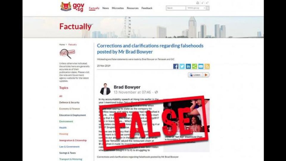 นายโบว์เยอร์ได้แก้ไขโพสต์ของตน หลังเว็บไซต์อย่างเป็นทางการของรัฐบาลในการตรวจสอบข้อเท็จจริงออกแถลงการณ์ระบุว่า ข้อความของโบว์เยอร์ในโพสต์ดังกล่าวที่อ้างว่า รัฐบาลสิงคโปร์มีอิทธิพลต่อการตัดสินใจของกองทุนเทมาเส็กนั้น เป็นการใช้ข้อความเท็จและหลอกลวง