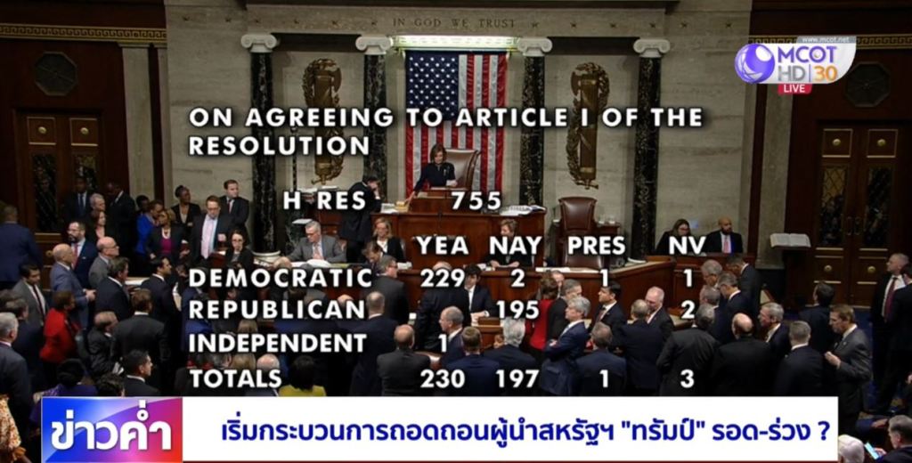 เริ่มต้นนับ 1 แล้ว กระบวนการถอดถอนทรัมป์ออกจากตำแหน่ง เมื่อสภาผู้แทนราษฎรที่พรรคเดโมแครตครองเสียงข้างมาก โหวตไฟเขียวถอดถอนทรัมป์ใน 2 ข้อหา คือ ใช้อำนาจโดยมิชอบ และขัดขวางการทำงานของรัฐสภา