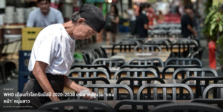 เมื่อเข้าสู่ทศวรรษใหม่ในปี 2020 องค์การอนามัยโลก (WHO) ประเมินว่า ประชากรที่มีอายุตั้งแต่ 60 ปีขึ้นไปรวมกันแล้วจะ ‘มากกว่า’ ประชากรวัยหนุ่มสาว รัฐบาลทั่วโลกต้องเตรียมตัวรับมือสิ่งที่จะตามมาจากปรากฏการณ์นี้ด้วย