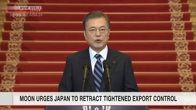 ประธานาธิบดีมุน แจ-อิน ของเกาหลีใต้ ได้แสดงความกระตือรือร้นที่จะปรับปรุงความสัมพันธ์ทวิภาคีกับญี่ปุ่น แต่เขากล่าวว่าจะเรียกร้องต่อไปให้ญี่ปุ่นทบทวนมาตรการควบคุมการส่งออก