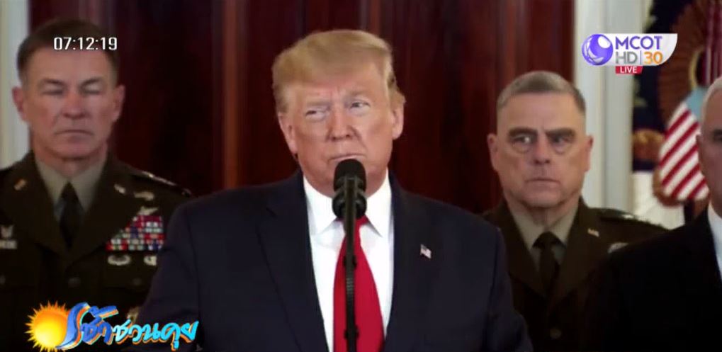 ประธานาธิบดีโดนัลด์ ทรัมป์ ใช้เวลาแถลงข่าวนาน 10 นาที เมื่อช่วง 11.00 น.ตามเวลาสหรัฐ หรือ 23.00 น.คืนที่ผ่านมา ตามเวลาบ้านเรา ระบุการโจมตีของอิหร่านถล่มฐานทัพสหรัฐที่เมืองอาร์บิลและฐานบินอัล อัสซาด นอกกรุงแบกแดดในอิรัก เมื่อคืนวันพุธ ตามเวลาอิรัก ไม่ก่อให้เกิดความเสียหายรุนแรง ไม่มีทหารอเมริกันหรือชาวอิรักได้รับอันตราย