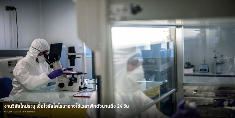 งานวิจัยใหม่ของจีนระบุ เชื้อไวรัสโคโรนาอาจจะมีระยะเวลาการฟักตัวนานถึง 24 วัน ขณะที่จีนยืนยันไม่พบหลักฐานการแพร่กระจายของเชื้อไวรัสฯ ผ่านอากาศ