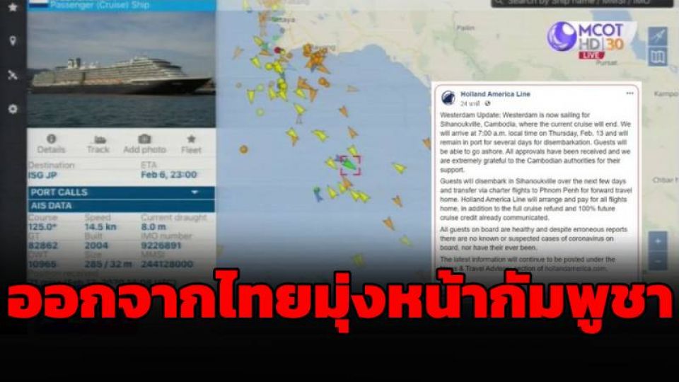 กรณีเรือสำราญเวสเตอร์ดัม (Westerdam) หลังทางการไทย ยืนยันยังไม่อนุญาตให้เทียบท่า แต่พร้อมให้ความช่วยเหลือด้านมนุษยธรรม จากการตรวจสอบเว็บไซต์ vesselfinder.com ที่ใช้ติดตามเรือต่างๆ ทั่วโลก เมื่อเวลา 20.00 น.ที่ผ่านมา พบหันหัวเรือออกจากไทยแล้ว มุ่งหน้าไปสีหนุวิลล์ ประเทศกัมพูชา โดยมีเรือหลวงภูมิพลฯ ในตอนแรกที่อยู่ใกล้ๆ เริ่มทิ้งระยะห่างออกไป