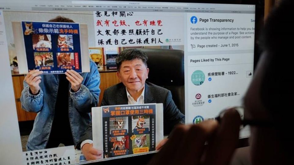 ด้านกระทรวงต่างประเทศไต้หวันใช้การ์ตูนนกพิราบสวมหน้ากากอนามัยรูปธงชาติไต้หวันเป็นมาสคอตแจ้งเรื่องข้อจำกัดการเข้าไต้หวันกับชาวต่างชาติที่มีประวัติเดินทางมาจากจีน พร้อมกับชูคำขวัญว่า “ไวรัสออกไป ความปลอดภัยเข้ามา” ขณะที่กระทรวงเศรษฐกิจกล่าวถึงข่าวลือเรื่องกล่องใส่อาหารแบบกระดาษใช้แล้วทิ้งกำลังขาดตลาดว่า เป็นการร้องโหวกเหวกโวยวายเกินจริงเหมือนเสียงห่านร้อง