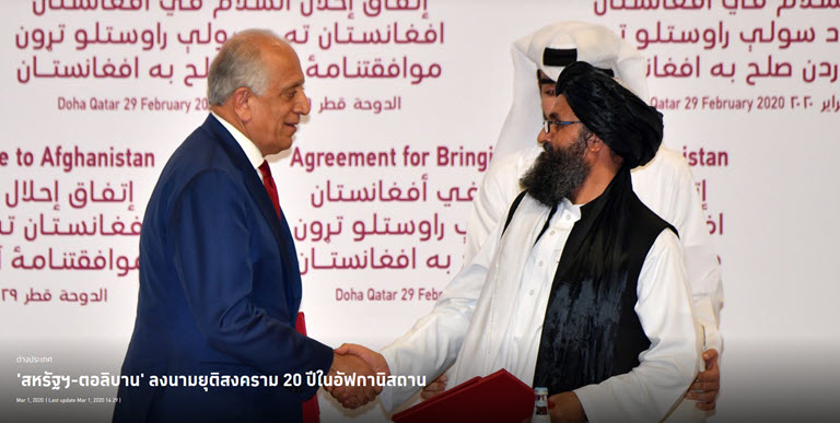 ตัวแทนรัฐบาลสหรัฐฯ และกลุ่มตอลิบานร่วมลงนามในข้อตกลงการยุติสงครามระหว่างกันหลังจากสู้รับกันมาอย่างยาวนานนับตั้งแต่ปี 2001 (พ.ศ.2544) โดยการลงนามดังกล่าวมีตัวแทนผู้นำจากประเทศต่างๆ เข้าร่วมเป็นสักขีพยาน ทั้งจากปากีสถาน กาตาร์ ตุรกี อินเดีย อินโดนีเซีย อุซเบกิสถานและทาจิกิสถาน