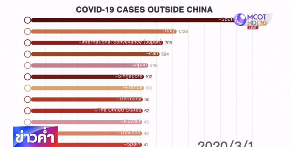 สำหรับยอดผู้ติดเชื้อในจีนล่าสุด อยู่ที่เกือบ 80,000 คน เสียชีวิตอีกเกือบ 3,000 คน ส่วนประเทศที่มีผู้ติดเชื้อมากสุดคือ เกาหลีใต้ มีผู้ติดเชื้อกว่า 3,500 คน รองลงมาเป็นอิตาลี มีผู้ติดเชื้อกว่า 1,200 คน ส่วนญี่ปุ่นมีผู้ติดเชื้อกว่า 700 คน