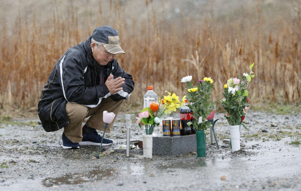 (Kazuo Sato puts his hands together in Namie, Fukushima Prefecture at a former post office site where his eldest son went missing in tsunami nine years ago)