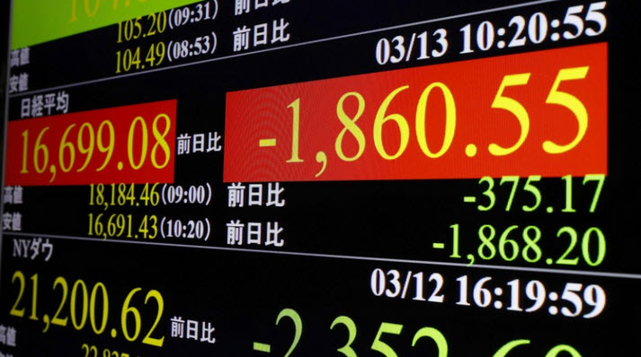 The 225-issue Nikkei Stock Average ended down 1,128.58 points, or 6.08 percent, from Thursday at 17,431.05, its lowest close since Nov. 11, 2016. The index lost 3,318.7 points for the five days through Friday, its largest-ever weekly fall.