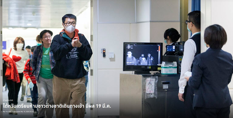 รัฐบาลไต้หวันได้เรียกร้องประชาชนงดเดินทางไปต่างประเทศหากไม่จำเป็น และล่าสุด ยังได้ยกระดับมาตรการควบคุมคนเข้าเมือง โดยห้ามชาวต่างชาติเกือบทั้งหมดเดินทางเข้าไต้หวัน มีผลตั้งแต่วันที่ 19 มี.ค. นี้เป็นต้นไป อย่างไรก็ตาม มาตรการนี้ยกเว้นให้กับชาวต่างชาติที่ถือใบถิ่นที่อยู่ (Alien Resident Certificate-ARC) เจ้าหน้าที่ทูต และนักธุรกิจที่มีใบอนุญาตเข้าเมืองพิเศษ โดยผู้ที่ได้รับอนุญาตเหล่านี้จะต้องผ่านการกักตัวเฝ้าระวังโรคเป็นเวลา 14 วัน ซึ่งรัฐบาลไต้หวันไม่ได้ระบุว่า มาตรการใหม่นี้จะสิ้นสุดลงเมื่อไร