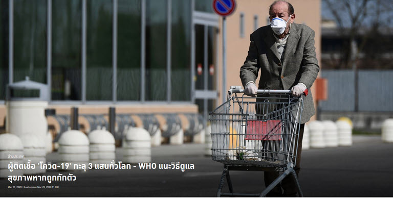 ขณะที่เว็บไซต์ worldometer ระบุ มีผู้เสียชีวิตแล้วประมาณ 14,641 ราย ทั้งยังพบผู้ติดเชื้อรายแรกเพิ่มเติมใน 4 ประเทศแถบแอฟริกาเมื่อวันที่ 22 มี.ค. ทำให้มีผู้ติดเชื้อแล้วใน 192 ประเทศและเขตปกครองทั่วโลก โดยกรณีของประเทศไทย พบผู้ติดเชื้อสะสม 559 ราย และผู้เสียชีวิต 1 ราย อ้างอิงตัวเลขของหน่วยงานภาครัฐ
