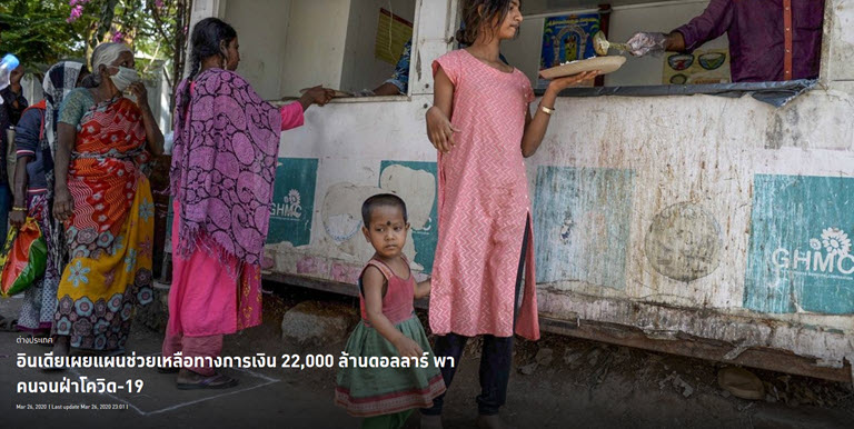 อินเดียประกาศแผนการช่วยเหลือทางการเงิน 22,000 ล้านดอลลาร์สหรัฐฯ ให้กับคนยากจนในประเทศที่ได้รับผลกระทบทางเศรษฐกิจจากการระบาดของโควิด-19