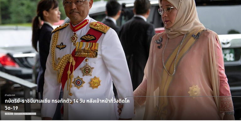 สมเด็จพระราชาธิบดีและสมเด็จพระราชินีแห่งมาเลเซีย ทรงกักตัวเป็นเวลา 14 วัน หลังพบเจ้าหน้าที่สำนักพระราชวังหลายคนติดเชื้อโควิด-19 อย่างไรก็ตาม ผลตรวจของทั้งสองพระองค์เป็นลบ