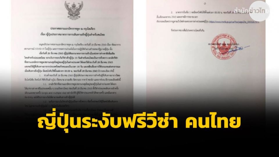 สถานเอกอัครราชทูต ณ กรุงโตเกียว ประเทศญี่ปุ่น โพสต์ข้อความผ่านทางเฟซบุ๊ก ระบุว่า ญี่ปุ่นออกมาตรการการเข้าเมืองต่อชาวไทย มีผลบังคับใช้ตั้งแต่เวลา 00.00 น. ของวันที่ 28 มีนาคม จนถึงสิ้นเดือนเมษายน นี้ และอาจมีการขยายเวลาออกไป โดยจะระงับการยกเว้นวีซ่าเข้าญี่ปุ่น 15 วัน สำหรับคนไทยเป็นการชั่วคราว ยกเลิกวีซ่าที่สถานเอกอัครราชทูต/สถานกงสุลใหญ่ของญี่ปุ่นในต่างประเทศ ได้ออกให้ก่อนวันที่ 28 มีนาคม 2563 อย่างไรก็ดี ผู้ที่มีวีซ่าประเภทเข้าได้หลายครั้ง และมีเอกสาร Re-Entry จะได้รับการยกเว้นให้สามารถเดินทางเข้าญี่ปุ่นได้