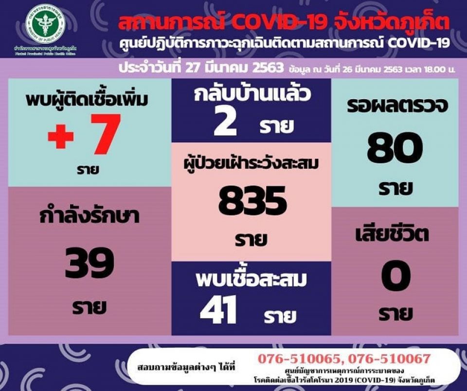 ด้านคณะกรรมการโรคติดต่อจังหวัดภูเก็ต รายงานสถานการณ์โควิด-19 วันที่ 5 ม.ค. – 26 มี.ค.2563 มีผู้ป่วยยืนยันติดเชื้อ 41 ราย (รวมรายล่าสุด 7 รายแล้ว) ในจำนวนนี้รักษาหายและกลับได้ 2 ราย ทั้งหมดอาการอยู่ในเกณฑ์ไม่รุนแรง ส่วน 80 ราย รอผลตรวจยืนยันทางห้องปฏิบัติการ สำหรับผู้ป่วยโควิด-19 ที่พบในจังหวัดภูเก็ตส่วนใหญ่เป็นกลุ่มผู้ที่มีความเกี่ยวพันกับสถานบันเทิงในพื้นที่ ซ.บางลา ต.ป่าตอง อ.กะทู้ จ.ภูเก็ต ซึ่งทีมงานสาธารณสุขจังหวัดภูเก็ตและผู้เกี่ยวข้องได้ดำเนินการสอบสวนผู้ป่วยทุกราย เพื่อควบคุมและป้องกันโรคตามแนวทางของกระทรวงสาธารณสุข.-