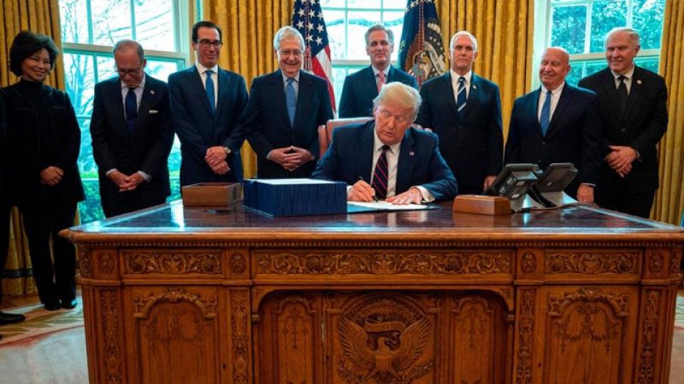 วอชิงตัน 28 มี.ค.- ประธานาธิบดีโดนัลด์ ทรัมป์ของสหรัฐ เร่งลงนามร่างมาตรการช่วยเหลือครั้งใหญ่ที่สุดในประวัติศาสตร์ประเทศ มูลค่า 2.2 ล้านล้านดอลลาร์สหรัฐ (ราว 71.39 ล้านล้านบาท) แล้วเพื่อรับมือผลกระทบทางเศรษฐกิจอันเกิดจากการแพร่ระบาดของโรคติดเชื้อไวรัสโคโรนา 2019 หรือโควิด-19