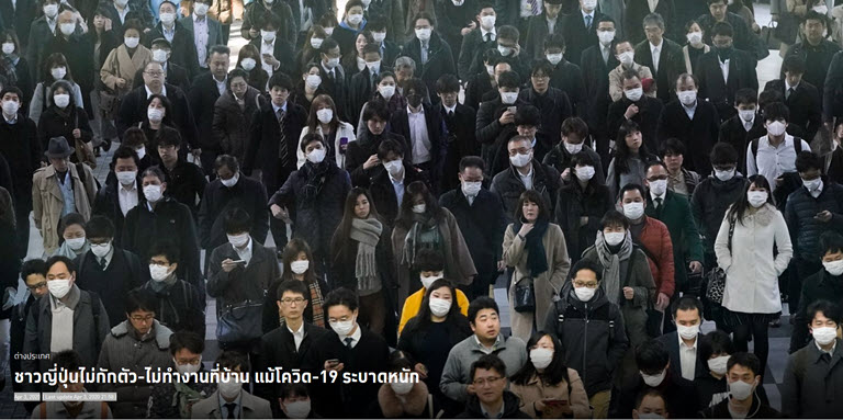 CNN Business รายงานว่า แม้ขณะนี้การระบาดของไวรัสโควิด-19 จะทวีความรุนแรงขึ้นอย่างต่อเนื่อง จนจำนวนผู้ติดเชื้อสะสมทั่วโลกรวมกันมากกว่า 1 ล้านคนแล้ว และมีผู้เสียชีวิตทั่วโลกอีกอย่างน้อย 46,800 ราย ตามการอ้างอิงข้อมูลจาก Johns Hopkins University แต่สถานการณ์ในประเทศญี่ปุ่นกลับดำเนินไปอย่างค่อนข้างจะเป็นปกติ โดยเห็นได้ชัดว่าประชาชนจำนวนมากยังคงเดินทางออกจากบ้านมาทำงานที่ออฟฟิศ และโดยสารรถไฟสาธารณะกันอย่างหนาแน่นในชั่วโมงเร่งด่วน