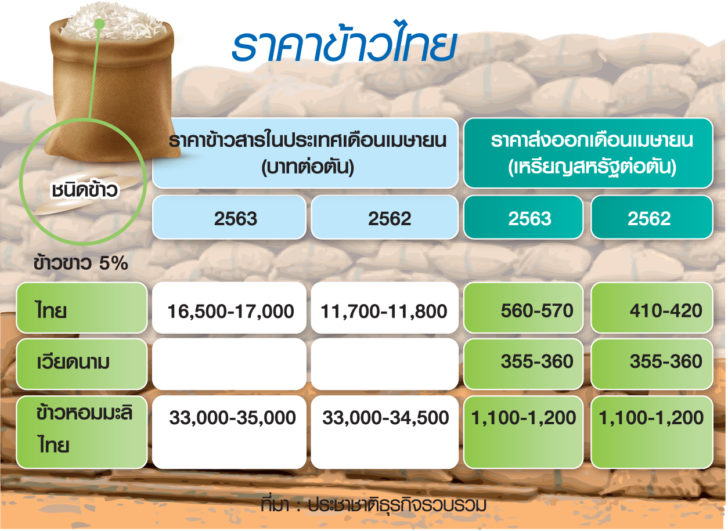 “ปีนี้เป็นปีแรกในรอบ 3 ปีที่ราคาข้าว 5% ผงกหัวขึ้นมาจากที่เคยตันละ 370-380 เหรียญสหรัฐ เป็นตันละ 500 เหรียญสหรัฐ คิดเป็นราคาข้าวสาร 5% ตันละ 16,500 บาท จาก 3 ปีก่อนที่ราคาทรง ๆ ตันละ 11,500-12,000 บาท คิดทอนเป็นราคาข้าวเปลือก 5% ความชื้น 15% ตันละ 10,000-10,500 บาท จากเดิม 7,600-8,000 บาท แต่ถ้าราคาไทยแพงมาก ต่างประเทศก็ระมัดระวังสั่งซื้อใช้เท่าที่จำเป็น”