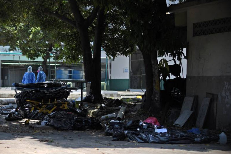 เมื่อวันเสาร์ที่ผ่านมา ที่โรงพยาบาลทีโอโดโร มัลโดนาโด คาร์โบ เมืองกัวยากิล เจ้าหน้าที่ทางการแพทย์ในชุดป้องกันและนิรภัยได้ทำการเคลื่อนย้ายศพผู้เสียชีวิตเพราะไวรัสซึ่งอยู่ในถุงเก็บศพ จากห้องเก็บศพและใช้แท่นวางสินค้าสำหรับเคลื่อนย้ายศพไปเก็บไว้ในตู้คอนเทนเนอร์แช่แข็งก่อน รวมถึงเก็บศพผู้เสียชีวิตที่วางทิ้งไว้ตามที่ต่างๆ เพื่อเอาไปเก็บไว้ก่อนให้เรียบร้อย หลังจากที่เคยมีภาพข่าวเผยแพร่ไปว่าศพผู้เสียชีวิตมีจำนวนมาก ไม่มีเจ้าหน้าที่มาจัดเก็บ เพราะยังอยู่ในช่วงมาตรการห้ามออกจากบ้าน และศพผู้เสียชีวิตมีมากจนล้นโรงพยาบาลและห้องเก็บศพ