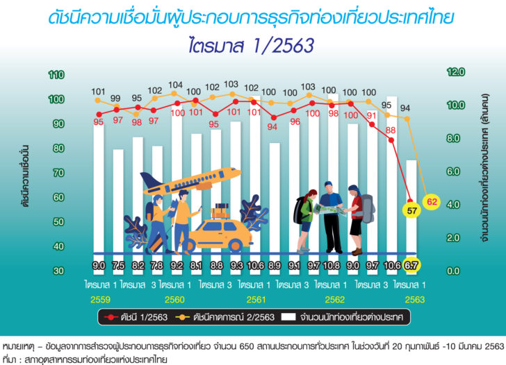 จากการสำรวจความเห็นผู้ประกอบการธุรกิจท่องเที่ยว 650 ราย ช่วง 20 กุมภาพันธ์-10 มีนาคม 2563 พบว่า ดัชนีความเชื่อมั่นผู้ประกอบการท่องเที่ยวไตรมาส 1/2563 เท่ากับ 57 ต่ำกว่าไตรมาส 4/2562 ที่อยู่ในระดับ 88 และลดลงจากไตรมาสเดียวกันของปีก่อนที่อยู่ในระดับ 98นับเป็นการลดลงต่ำที่สุดในรอบ 9 ปีที่ผ่านมา