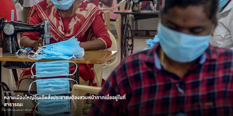ประชาชนหลายร้อยล้านคนในอินเดีย โดยเฉพาะกรุงนิวเดลีและนครมุมไบ ถูกสั่งให้สวมหน้ากากหรือปิดหน้าเมื่อต้องออกไปที่สาธารณะ หลังจากทางการอินเดียประกาศล็อกดาวน์ทั่วประเทศถึง 15 เม.ย. และคาดจะขยายเวลาเพิ่ม เพื่อควบคุมการระบาดของโควิด-19