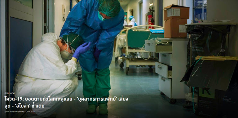 ขณะที่ ดร.เทดรอส อัดฮานอม เกเบรเยซุส ผู้อำนวยการองค์การอนามัยโลก (WHO) กล่าวในการแถลงข่าวที่นครเจนีวา สวิตเซอร์แลนด์ เมื่อ 10 เม.ย. ว่า ‘บุคลากรการแพทย์’ เป็นกลุ่มที่เสี่ยงต่อการติดเชื้อมากที่สุด เพราะต้องปฏิบัติหน้าที่ใกล้ชิดกับผู้ติดเชื้อและผู้ป่วยโรคโควิด-19 ทำให้สถิติบุคลากรการแพทย์ติดเชื้อเพิ่มขึ้นทั่วโลกประมาณ 10 เปอร์เซ็นต์ และประเทศต่างๆ ต้องปกป้องบุคลากรเหล่านี้อย่างจริงจัง