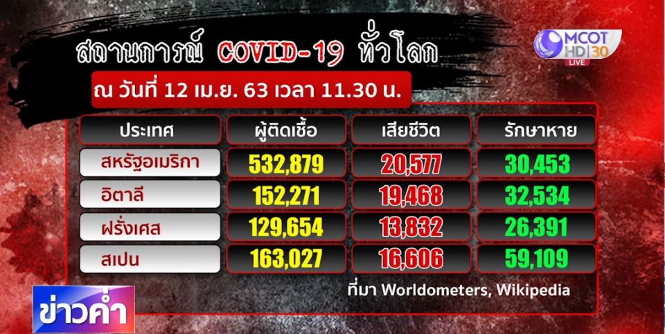 ข้อมูลขององค์การอนามัยโลก หรือ WHO รายงานสถานการณ์ของโควิด-19 ล่าสุด อันดับ 1 สหรัฐอเมริกา มีผู้ติดเชื้อและผู้เสียชีวิตมากที่สุดในโลก โดยมีผู้ติดเชื้อเพิ่มขึ้นร้อยละ 5 ตามมาด้วยอิตาลี เป็นอันดับ 2 มีผู้ติดเชื้อกว่า 150,000 ราย เสียชีวิตกว่า 19,000 ราย อันดับ 3 ฝรั่งเศส, อันดับ 4 สเปน และอันดับ 5 สหราชอาณาจักร ที่มีอังกฤษ, ไอร์แลนด์เหนือ, เวลส์ และสกอตแลนด์.