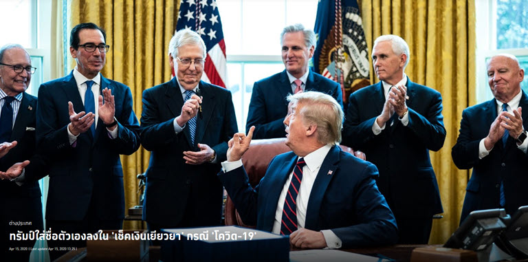 สื่อสหรัฐฯ รายงานว่า ทรัมป์เป็นประธานาธิบดีคนแรกที่มีชื่อระบุลงไปในเช็คเงินเยียวยาประชาชน ขณะที่กระทรวงการคลังทยอยจ่ายเงินให้ชาวอเมริกันผู้ได้รับผลกระทบจากการดำเนินมาตรการล็อกดาวน์ป้องกันโรคโควิด-19