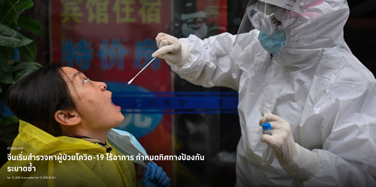 จีนได้เริ่มการเพิ่มกรณีผู้ติดเชื้อไร้อาการลงไปในสถิติผู้ติดเชื้อรายวันตั้งแต่เมื่อช่วงต้นเดือนนี้ ท่ามกลางความกังวลว่าคนกลุ่มนี้อาจทำให้เกิดการระบาดระลอกสองขึ้นเมื่อทางการได้คลายมาตรการล็อกดาวน์ในเมืองอู่ฮั่นและที่อื่นๆ ส่วนล่าสุดวันนี้ (15 เม.ย.) จีนรายงานพบผู้ติดเชื้อรายใหม่ 103 ราย ในจำนวนนี้ 39 รายเป็นผู้ติดเชื้อนำเข้า และจากจำนวนผู้ติดเชื้อทั้งหมดมี 57 ราย ที่ไม่แสดงอาการ
