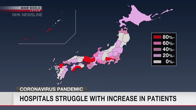 9 จังหวัดรายงานว่า เตียงในโรงพยาบาลมากกว่าร้อยละ 80 มีผู้ป่วยใช้อยู่ ซึ่งรวมถึงโตเกียว โอซากา เฮียวโงะ และฟูกูโอกะ ซึ่งรัฐบาลญี่ปุ่นได้ประกาศภาวะฉุกเฉิน ส่วนอีก 5 จังหวัด ซึ่งรวมถึง เกียวโต และ โอกินาวา ยังไม่อยู่ภายใต้ภาวะฉุกเฉิน