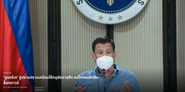 ประธานาธิบดี ‘โรดริโก ดูแตร์เต’ ขู่จะใช้การลงโทษแบบกฎอัยการศึก เพื่อหยุดประชาชนที่ไม่เคารพมาตรการล็อกดาวน์ควบคุมการระบาดของไวรัสในกรุงมะนิลา